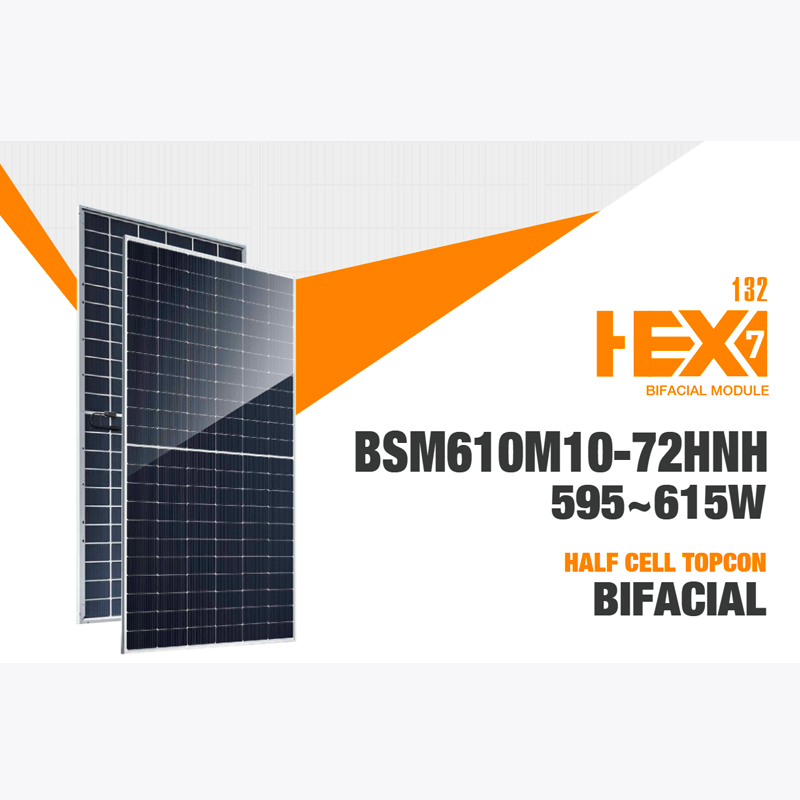 Panel solar bifacial de media celda Bluesun de 610 W con la última tecnología TOPCon tipo N. Diseñado para aplicaciones comerciales, este panel ofrece una impresionante eficiencia de hasta el 23,2 % y está diseñado para soportar condiciones ambientales adversas, garantizando un rendimiento fiable.